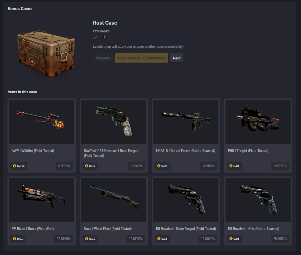 Recently added to the platform, case opening allows users to try their luck at unboxing valuable CS2 skins. This popular feature broadens CSGOEmpire's appeal beyond traditional gambling, attracting collectors and skin enthusiasts to the platform.